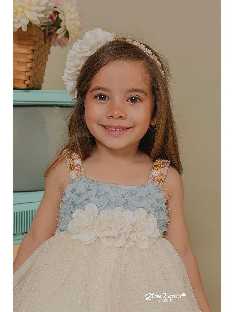 Vestido tono crema combinado con azul, dorado y hermoso diseño parte trasera y canutillo, que le da un toque de romanticismo