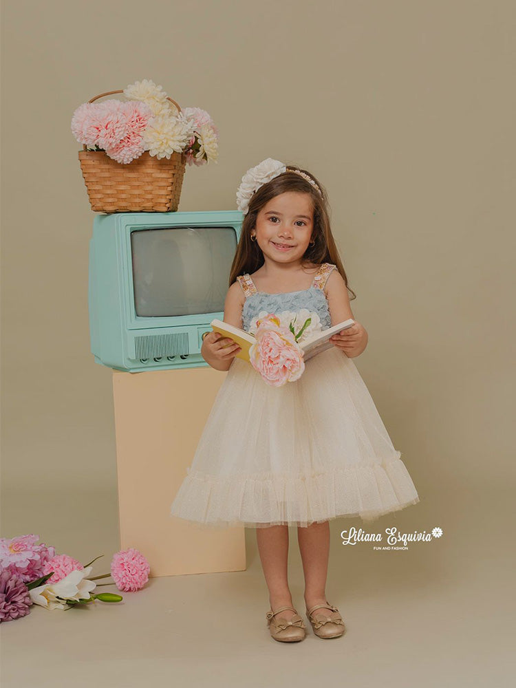 Vestido tono crema combinado con azul, dorado y hermoso diseño parte trasera y canutillo, que le da un toque de romanticismo
