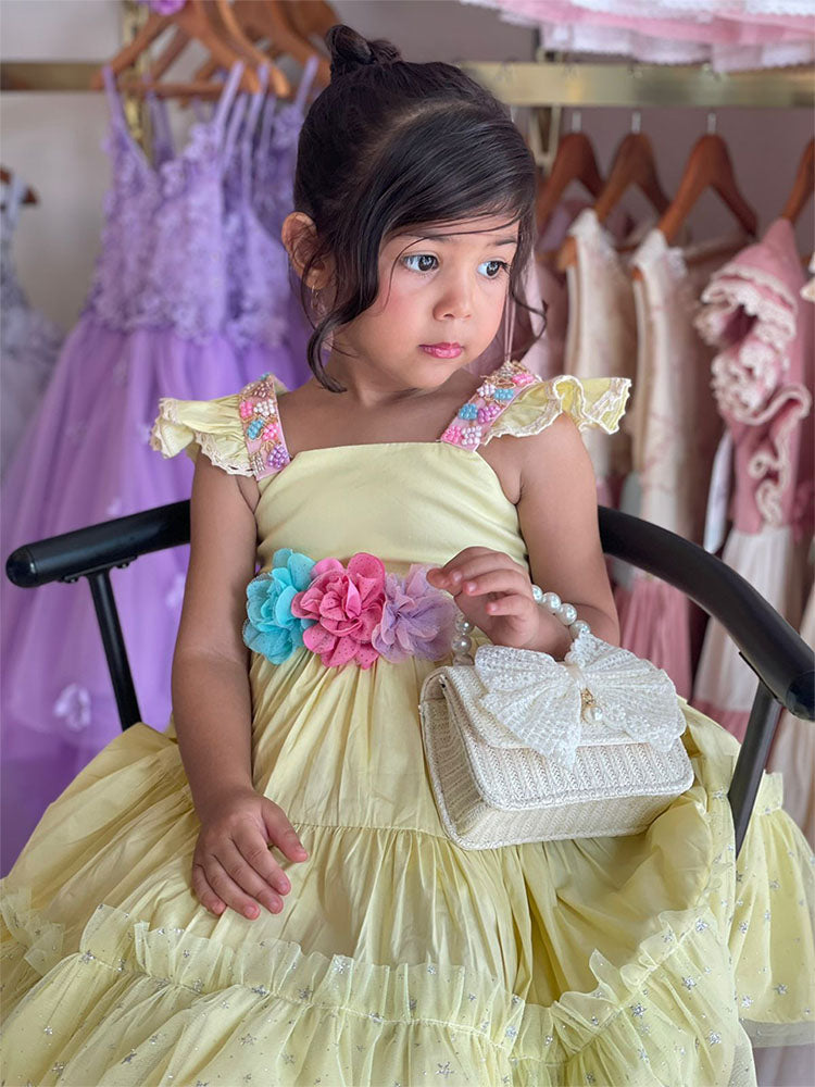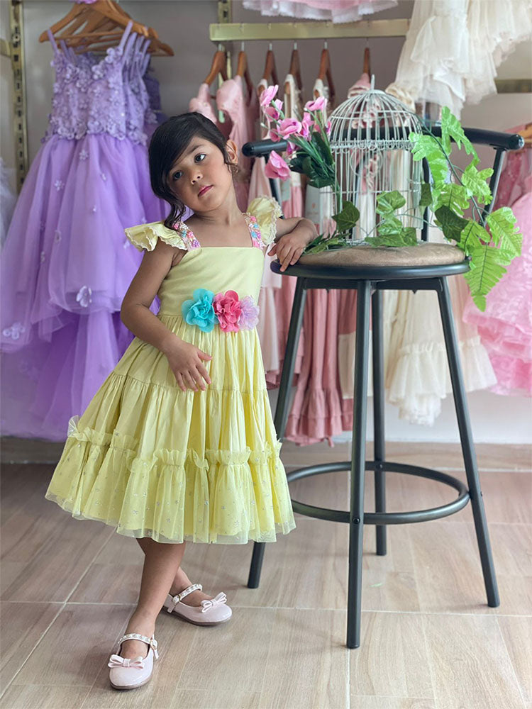 Vestido tono amarillo, con diseño y decorado con canutillo y flores parte delantera