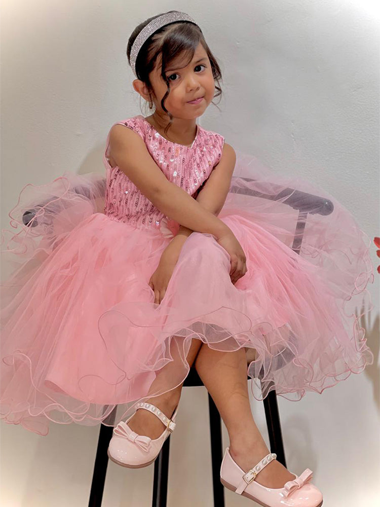Vestido tono curuba, con diseño lentejuelas parte superior del vestido