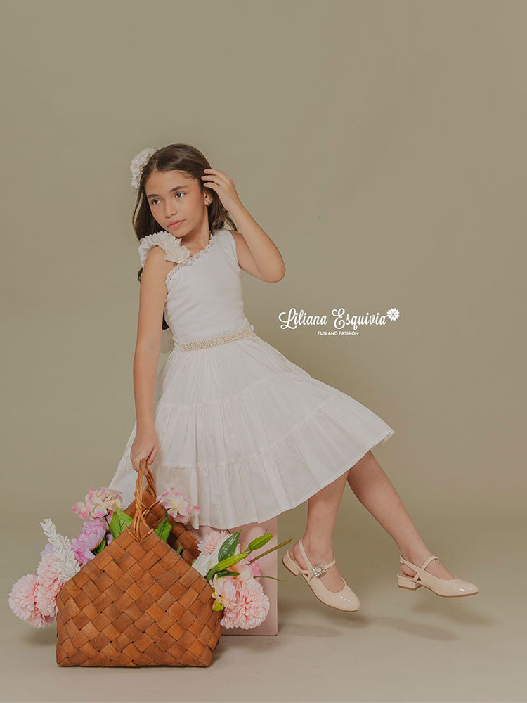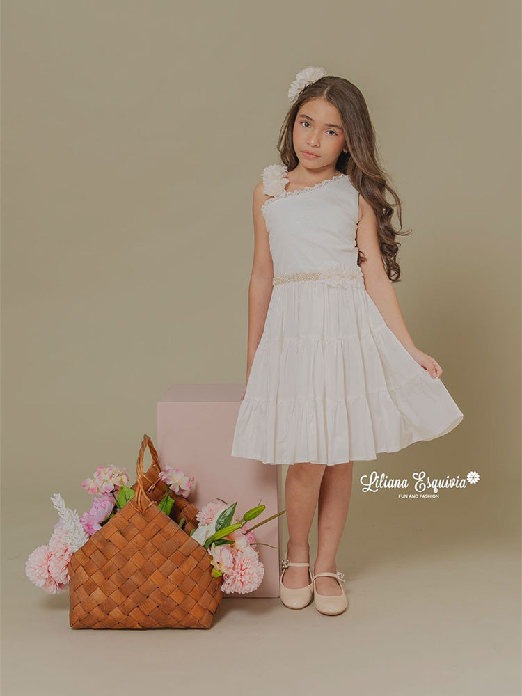 Vestido tono crema, con hermoso diseño de flores parte superior
